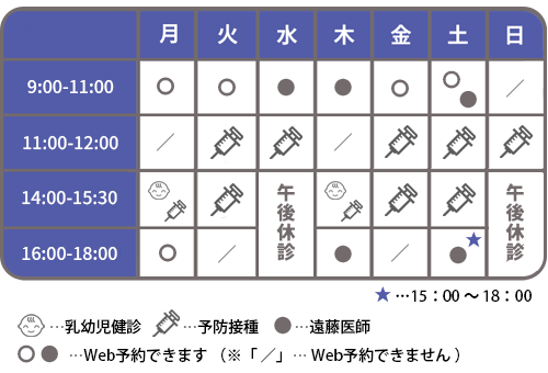 乳幼児健診・予防接種:水曜日 10:40~12:00/木曜日 14:00~15:30